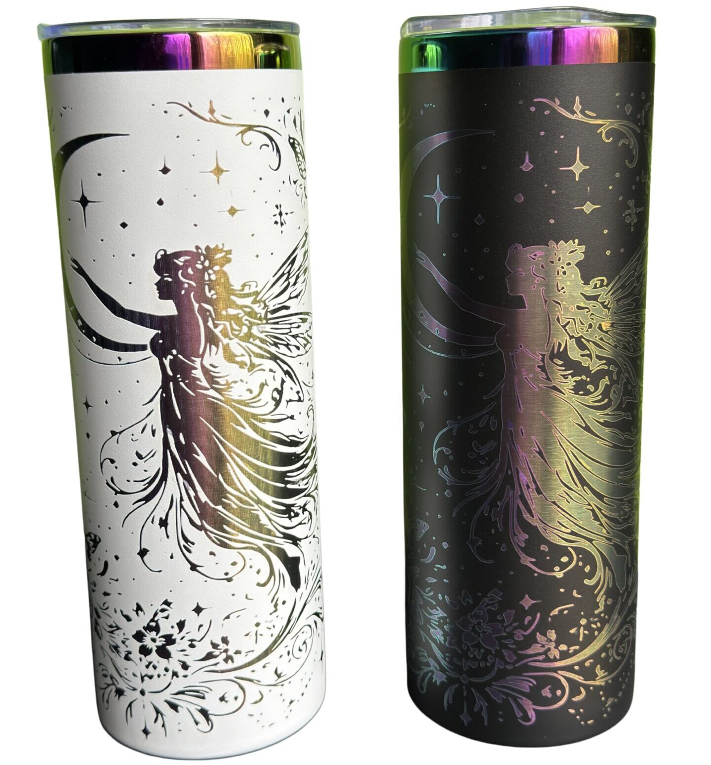 Step into a world of quiet beauty and celestial charm with this stunning 20 oz iridescent fairy tumbler. Designed to capture the serenity of a moonlit night, this piece showcases a graceful fairy surrounded by delicate butterflies and shimmering stars, creating a scene that feels both ethereal and refined.