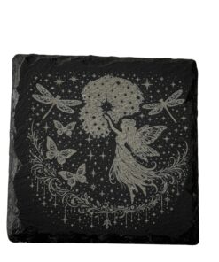 Each coaster features a graceful, winged fairy reaching upward toward a cluster of delicate butterflies, or dragonflies surrounded by intricate, flowing details that feel both whimsical and refined. This two pack is natural slate, the background adds a rich, textured contrast, making the artwork stand out with a sophisticated, almost storybook-like charm.