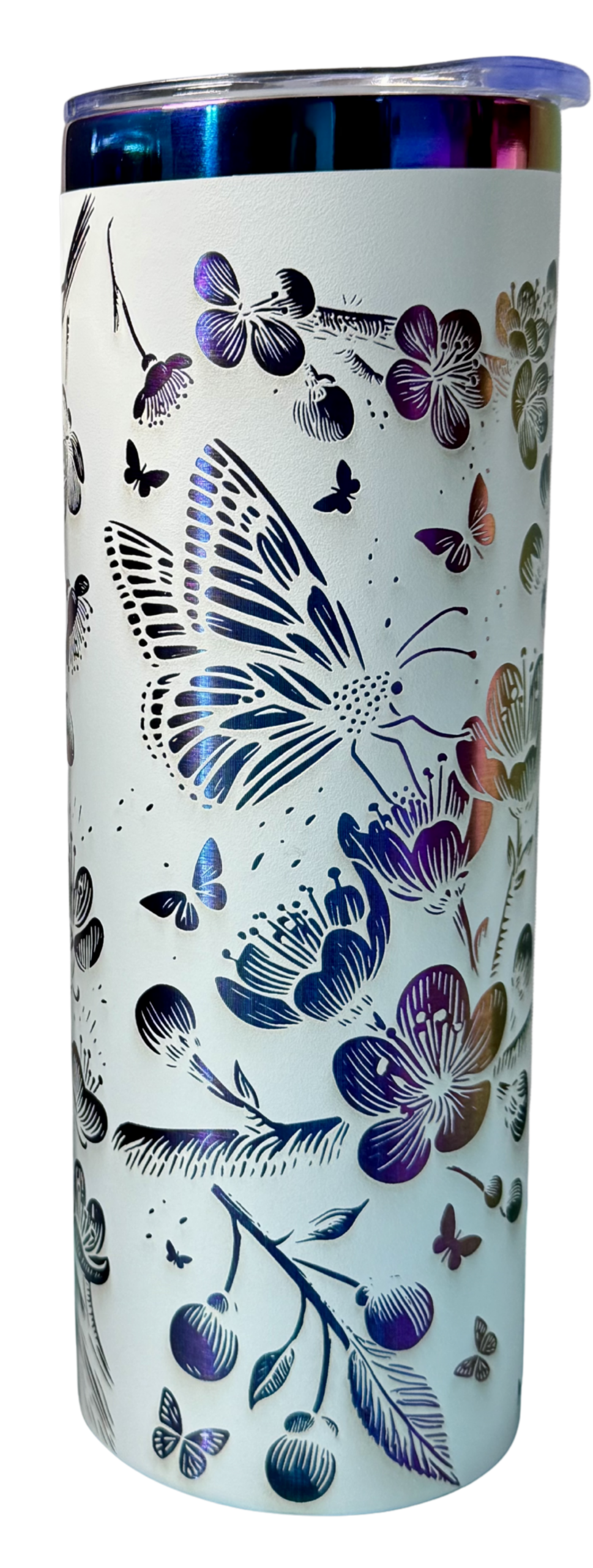 Bring beauty, elegance and everyday convenience together with one of these stunning 20-ounce Engraved iridescent Cherry blossom tumbler exclusively designed as a one of a kind just for you. This breathtaking stainless-steel tumbler features delicate cherry blossoms dancing among graceful butterflies creating a design that feels light feminine and full of life as light reflects across the tumbler surface the iridescent finish reveals shimmering hues of blue, violet gold making every angle look like a piece of art. Whether you’re sipping your morning coffee or enjoying iced tea in the afternoon or staying hydrated throughout the day this Tumblr is designed to keep your drinks hot or cold for hours while looking absolutely beautiful in your hand.